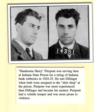 Dillinger served the first few years of his sentence at Pendleton, a few miles northeast of Indianapolis, but was later transferred to the Indiana State Prison at Michigan City. There, he met Harry Pierpont and other experienced bank robbers. Inmates were used as cheap labor for several manufacturing businesses that operated on the prison grounds. Dillinger, Pierpont and others worked in the Shirt Shop and passed the time talking about how to rob banks.