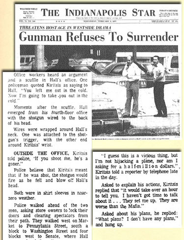 Employees at Meridian Mortgage noticed that the burly little man with sideburns was carrying a long box as he stepped into the office of mortgage executive Richard O. Hall. They had no reason to suspect the box might contain a sawed-off shotgun until they saw Hall emerge from his office with the barrel wired to the back of his neck. Behind him walked Kiritsis, his hand on the trigger.