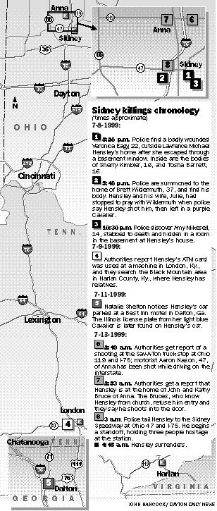 Sources:4 SHOT DEAD IN SIDNEY -- Gunman still on the loose; By Lisa Perry, Ben Sutherly and Mara Lee Dayton Daily News; Published: Friday, July 9, 1999 ; Page: 1A SUSPECT HAS SEX RECORD -- Lawrence Michael Hensley has public indecency raps and asked for counseling; By Jim Bebbington Dayton Daily News; Published: Saturday, July 10, 1999 ; Page: 1A SEX SECRETS MAY BE MOTIVE -- Slaying suspect remains at large; By Tom Beyerlein and Steve Bennish Dayton Daily News; Published: Saturday, July 10, 1999 ; Page: 1A HENSLEY BEHIND BARS -- Suspect in 4 killings gives up; By Scott Elliott, Steve Bennish, Jim Bebbington and Tom Beyerlein Dayton Daily News; Published: Wednesday, July 14, 1999 ; Page: 1A HENSLEY INDICTED, MAY FACE EXECUTION -- Jury hears from a woman who survived and may have witnessed the rampage; By Tom Beyerlein Dayton Daily News; Published: Friday, July 16, 1999 ; Page: 1A File created: 7-15-1999 Compiled by: DDN LIbrary staff