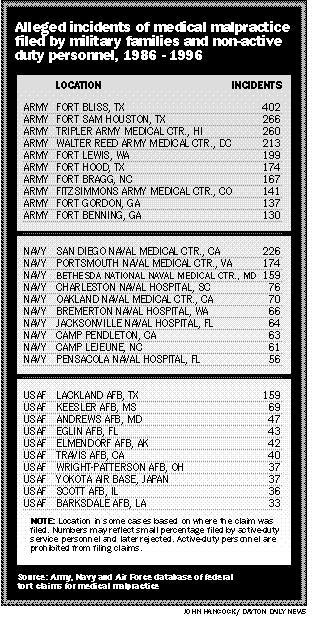 McKinley, a retired Army sergeant, had diabetes, high blood pressure, angina and a history of high cholesterol. An electrocardiogram showed an abnormal heartbeat. A chest X-ray revealed a buildup of calcium in his aorta, the body's main artery. McKinley, 67, saw Dr. Andrew Curtis Faire at the William Beaumont Army Medical Center here seven times in the months before he died. Dr. Faire, suspecting sore muscles were causing the abrupt pains in McKinley's arms and shoulders, prescribed an anti-inflammatory drug. Three weeks after the last visit, McKinley was dead. An autopsy would later show his arteries were 95 percent clogged in places. Had the coronary artery disease been diagnosed, a Houston cardiologist told government lawyers, McKinley "probably would have had a bypass and ... probably would still be alive today." To settle a medical malpractice claim, the government agreed a few months ago to pay Pauline McKinley approximately $300,000. Her claim represents one of 402 cases of alleged medical malpractice at Beaumont from 1986 to 1996. Those cases push Beaumont to a grim distinction: the hospital with more malpractice claims than any other military health facility in America. A Dayton Daily News examination found William Beaumont not only was targeted for more malpractice claims than any other hospital, just four other hospitals had even half as many claims as Beaumont did over the 10 years. Beaumont, a 306-bed hospital at Fort Bliss on the outskirts of El Paso, was targeted for more claims than the combined total for the Bethesda Naval Medical Center and the Walter Reed Army Medical Center, which together have three times as many beds. Why Beaumont would have so many more claims than other hospitals is not clear. In fact, documents filed with court cases and interviews with lawyers and military health care experts show the problems at Beaumont occur to some degree in all 115 hospitals and medical centers and 471 clinics that make up the Military Health Services System. The overall problems appear to stem from a variety of sources, including: * Downsizing: The military reduced the number of physicians by 8 percent between 1991 and 1995 and is expected to force an additional 8 percent reduction by 2000. While the entire military has been downsized, many hospitals face increasing patient loads. That's because retirees like McKinley are eligible for health care through the military. And as more members of the all-volunteer Army reach the 20-year retirement eligibility, the number of retirees and their families is expected to grow through the end of the century. In one internal Department of Defense survey, 13 percent of the patients complained of having to wait an hour or more to see a doctor. * ``Take-a-number'' patient management: Understaffing, poor records management and the constant shuffling of personnel in military hospitals and clinics undermines continuity of care and forces many beneficiaries to see whatever doctor is available. Many patients are forced to carry their medical records with them every time they see a doctor. * A fortress-like bureaucracy: The secrecy found in all medical centers is compounded in the military by policies and command structures that appear to place greater value on the doctor's protection than on the patient's right to know. Patients may never find out what happened to them, and even when they do they are forbidden by law to name the doctor as a defendant in a malpractice lawsuit. * Changing and often contradictory priorities: Primarily responsible for training young doctors to go to war, military hospitals are serving needs far removed from the battlefield. Defense Department records show the top two reasons for military hospitalizations in 1992 were the delivery of babies and the care of newborn infants.