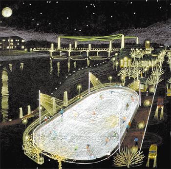 Dayton Daily News LibraryDowntown Dayton: The RiverScape Project Above: The "Five Rivers Fountain" would be created by five water cannons shooting 200 feet into the air. Below, right: At night lasers would be projected from towers, replacing the fountain with a star. In winter, the plaza would be an ice skating rink. | On March 11, 1998 a downtown development team led by David Holmes unveiled a dramatic $24.4 million plan to redesign Downtown Dayton's riverfront. The centerpiece would be a 200-foot five-cannon fountain which would convert into a star-shaped laser display at night. The project, which would also include an expanded Van Cleve Park, a "canal" walkway and a tribute to Dayton inventors, is to be coordinated with other downtown development projects, including the proposed baseball stadium. | Holmes, CEO of Reynolds & Reynolds, said the Reynolds Foundation would pledge $1 million toward theproject. The Miami Conservancy District pledged $500,000, and Five RiversMetroParks promised $500,000. In addition, the regional park district willsponsor riverfront programs and provide security and maintenance. The plan calls for developmentover three phases, the first two funded by $24.4 million in public funds andprivate contributions, the third phase to be mostly privately funded.Construction of phase one is expected to begin a year from now; work on thesecond phase would begin in 2001 and conclude in time for Dayton's celebrationof the 100th anniversary of powered flight in 2003.