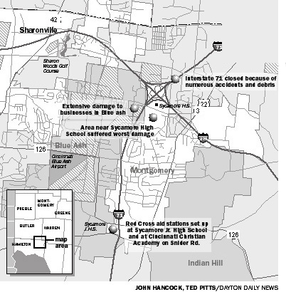 Dayton Daily News Library WEATHER EMERGENCIES - 1999 Four killed in tornado near Cincinnati Just before sunrise on April 9, 1999 a tornado ripped through the affluent northeast Cincinnati suburbs of Montgomery, Blue Ash and Symmes Twp., killing four people. The dead were later identified as Charles Smith of Clermont County and Donald E. Lewis of Blanchester, both of whom were in their cars. The other two victims died in their home. They were Lee and Jacqueline Cook of 7575 Cornell Road in Montgomery. The only confirmed touchdown was in Blue Ash, but the storm caused damage in Hamilton, Clinton and Warren counties. More than 200 homes were destroyed and 300 more were damaged. |  |