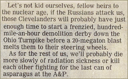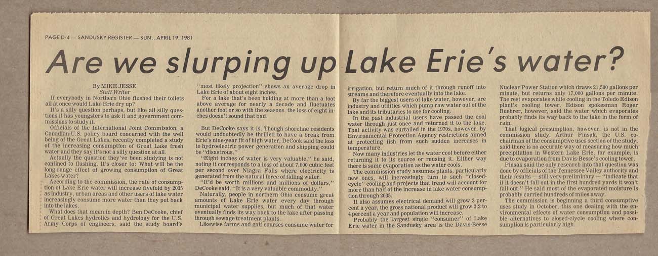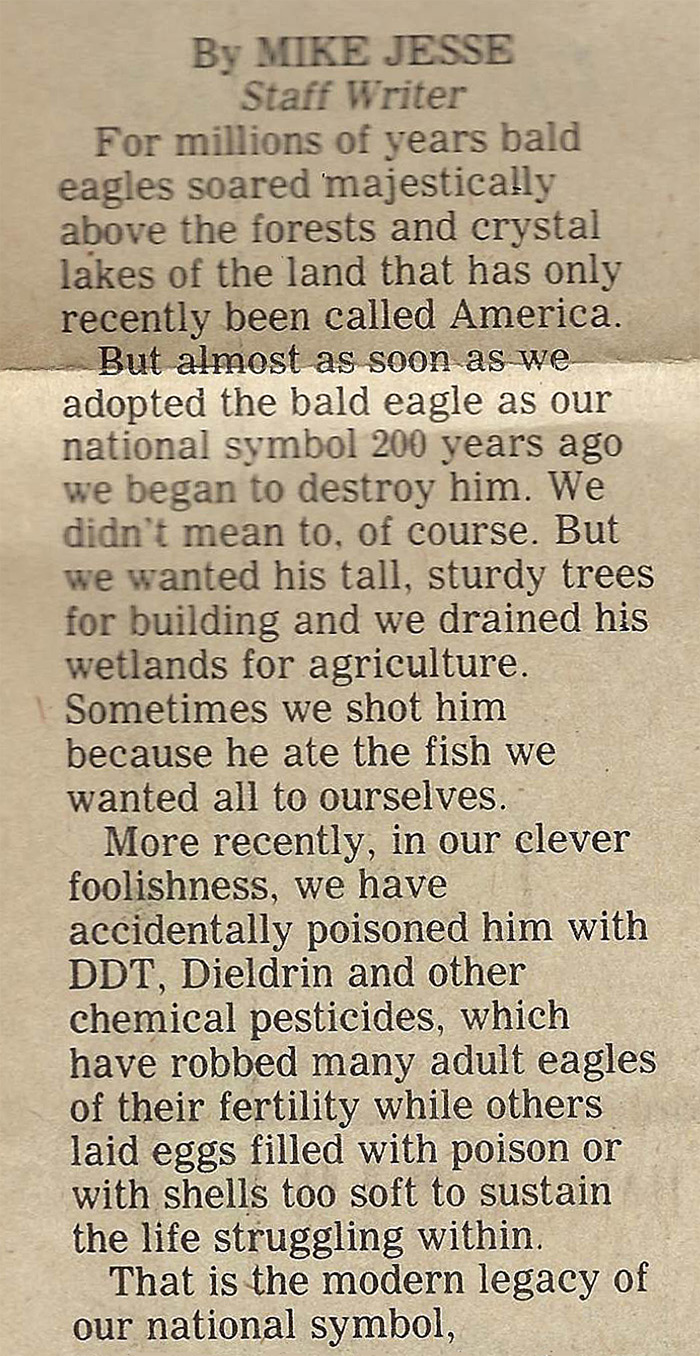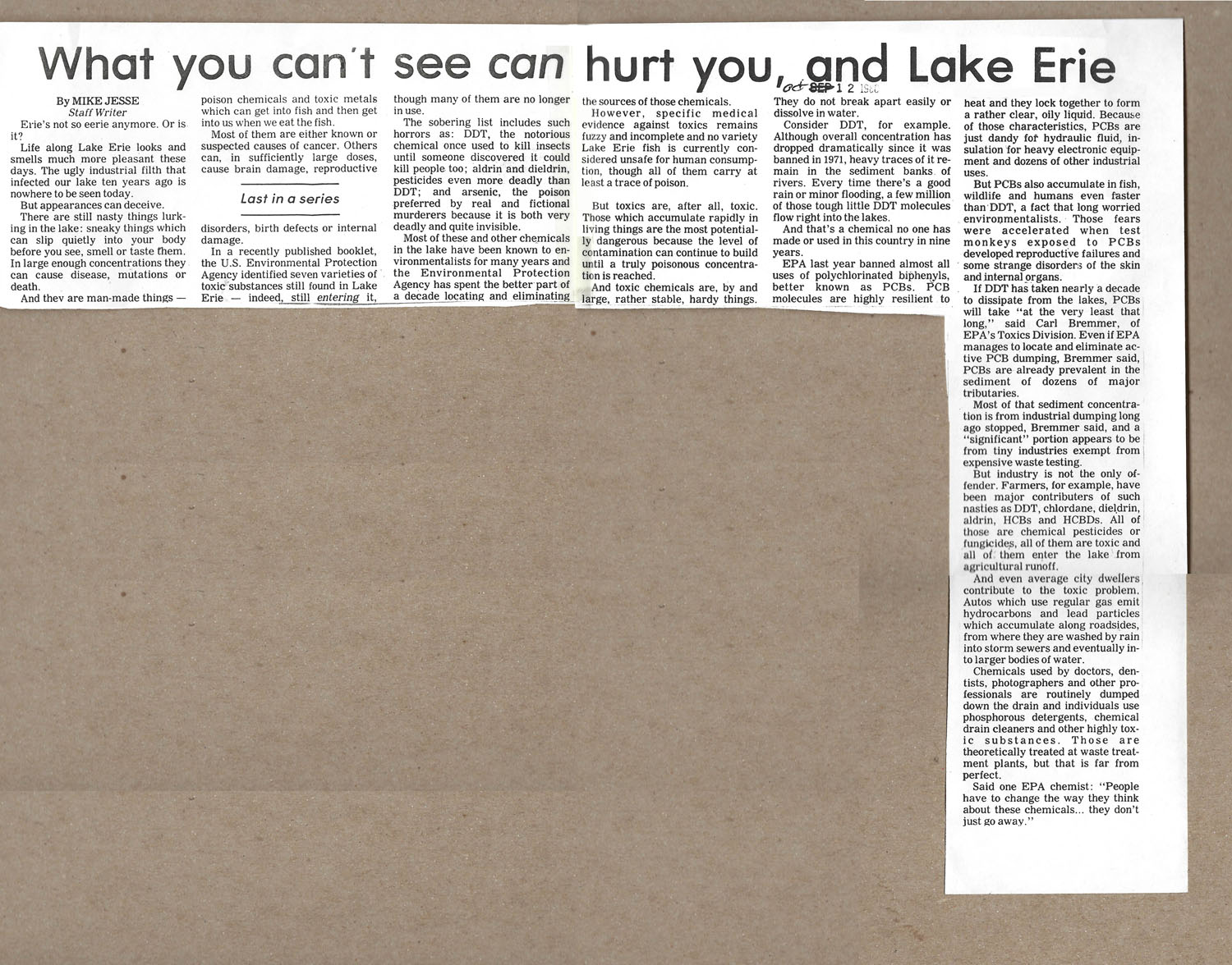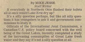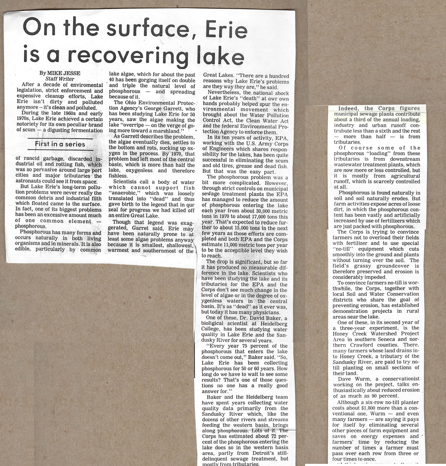 My first beat was police and fire, so every morning I made the rounds at the city police and the county sheriff's office. I also covered some criminal trials and did occasional feature stories. I later moved to the State desk, where my beat included anything related to state and federal government. Not that we covered those levels of government on a daily basis. I kept track of what our legislators and congressmen were up to and issues about state and federal agencies. On the State Desk, we also covered many of the surrounding smaller towns. One of the towns I covered was Milan, which was the birthplace of Thomas Edison. A few times I covered the town of Clyde, which was the basis of Sherwood Anderson's "Winesburg." I also covered Kelly's Island, which is one of several islands off the coast of Sandusky. I also wrote several environmental stories about Lake Erie. Some were about water quality, agricultural fertilizer runoff, and other science/policy matters, but also there was a program to repopulate bald eagles along Lake Erie, and I went with a guy from the Department of Natural Resources who showed (from a distance) the locations of the nests.