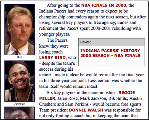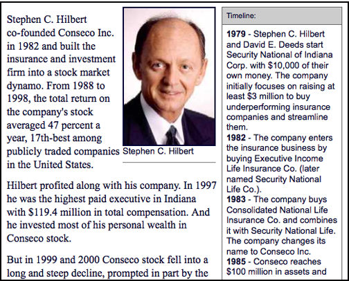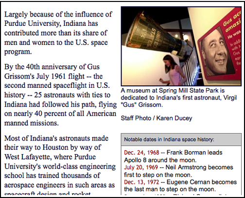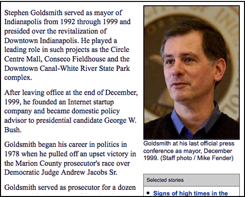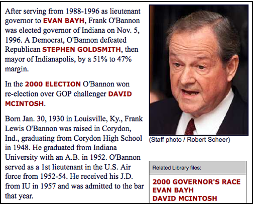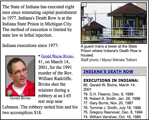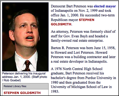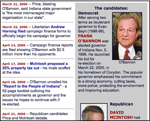 When I came back to The Indianapolis Star in 2000, I was eager to begin recreating the work I had done in Dayton -- and now I had a larger staff to help me do it. Most notably, Barb Hoffman had previously compiled lists and chronologies on the newsroom ATEX system. For example, there were ATEX files listing all previous Indianapolis mayors, police line-of-duty deaths, death penalty cases, etc. So we started by converting that resource to an internal website and then adding to it the more encyclopedic types of pages I had done in Dayton.