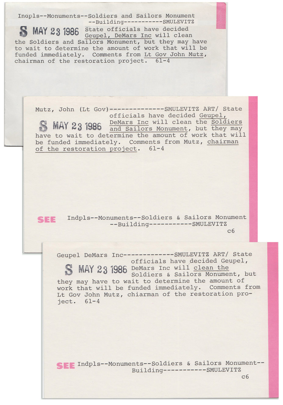 The topic headings were quite specific and had a hierarchy. For example: "Public Schools--Indpls--Teachers--Salaries" or "Indpls--Monuments--Soldiers and Sailors Monument--Building."