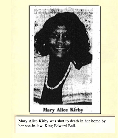 Next, Bell drove to the home of his wife's mother, Mary Alice Kirby, 54, in the 3200 block of Sutherland Avenue, and he pulled into the parking lot of the Crossroads Rehabilitation Center next door. His wife, Bertha Mae, came out of the house to confront him, and he shot her several times. Then he went inside the house and killed his mother-in-law in her dining room, and came outside and shot Bertha Mae again.