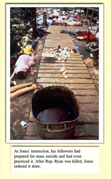 Back at the compound, Jones gathered the faithful and told them it was time to die. They had prepared for this day, even rehearsed it. They brought out big tubs in which they mixed the cyanide in with a powdered grape drink similar to Kool-Aid, and one by one they drank it and died. Not everyone took it willingly. Some were forced to drink it, and those who resisted were shot. A small few survived by fleeing into the jungle.