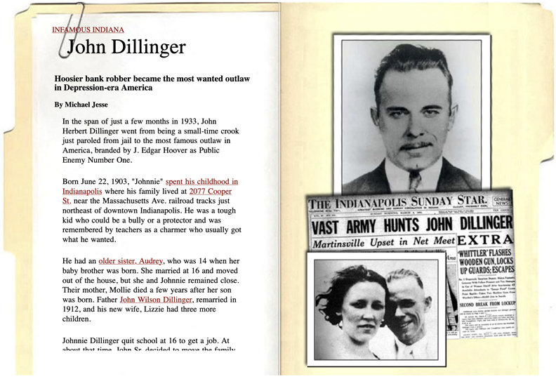 Infamous IndianaI wrote versions of most of these to post on IndyStar.com, along with photo galleries (which were preferred by managers because they boosted pageview counts). Later, for my own site, I made this project using a facing-page approach in which the left page scrolls with the narrative (without moving the overall page) and the links from the narrative open on the right-hand page. I was also, of course, going for a retro approach visually. This sort of thing had already become an avenue of website design that we all had to forego because, for one thing, iframes were bad for SEO, and also we needed to start designing for mobile devices, which were too small to view this kind of display. |