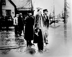 John H. Patterson, third from right, stands at the water's edge during the 1913 Flood. Patterson organized his employees at NCR to provide relief efforts for those stranded by the flood.