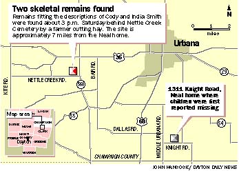 | On July 9, 1997 two children were reported missing from their Champaign County home. India Smith, 11, and her brother Cody, then 4, were reportedly last seen by their step-father, Kevin Neal, who said he last saw them playing in a side yard near the house. Two months later, on Sept. 6, two small bodies were found near a cemetery at Ohio 560 and Nettle Creek Road, about seven miles from the Neals' home. The bodies could not be immediately identified, but investigators said there was little doubt. |