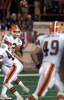 Cleveland Browns rookie quarterback Tim Couch (2) throws to tight end Mike Campbell (49) during the Browns' first game in three years. (AP Photo).