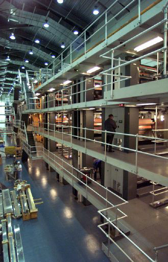 In the Spring of 1999, barely six months after celebrating its centennial, the Dayton Daily News began printing operations at its new Print Technology Center, the most advanced newspaper printing plant in North America. The $91 million printing plant, is located on 43 acres at 5000 Commerce Way, Franklin. The industrial park extends along I-75 north of the Ohio 73 interchange. During a five-month transition period the paper is operating both the new plant and the old press at its historic 1910 building at Fourth and Ludlow streets. When the PTC is fully operational in September 1999 about 250 production workers will work at the Franklin facilty while most of DDN's 950 employees would remain downtown or at area bureaus and distribution centers. News and advertising data are transmitted by fiber-optic cable from DDN's downtown headquarters to the PTC, where printing plates are made and mounted on presses six-stories tall. The presses were manufactured by Koenig & Bauer-Albert AG of Wurzburg, Germany. The building was designed by Cleveland architect Celso Gilberti. |  An interior view of the new pressroom. DDN PHOTO - SKIP PETERSON