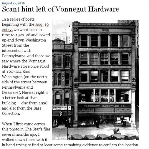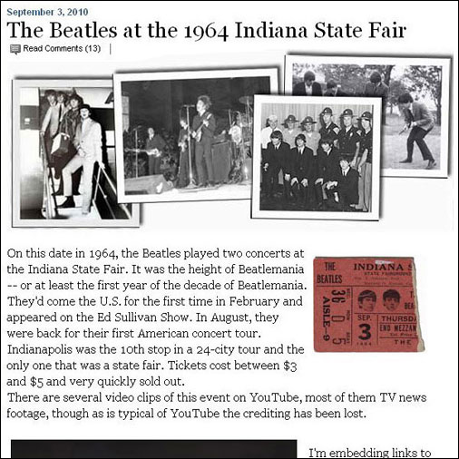 I knew at the time that there was a new upgrade coming for IndyStar's corporate "Saxotech" system, and I was afraid that when it came, it would undo my custom coding. When the upgrade rolled out, it was as I'd feared, and now there was only one image spot for each post, and the image would always be the same size and in the same location. I was so annoyed by the regimented new system that I stopped doing the blog and went back to the standard article format.